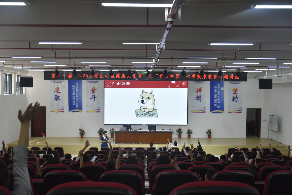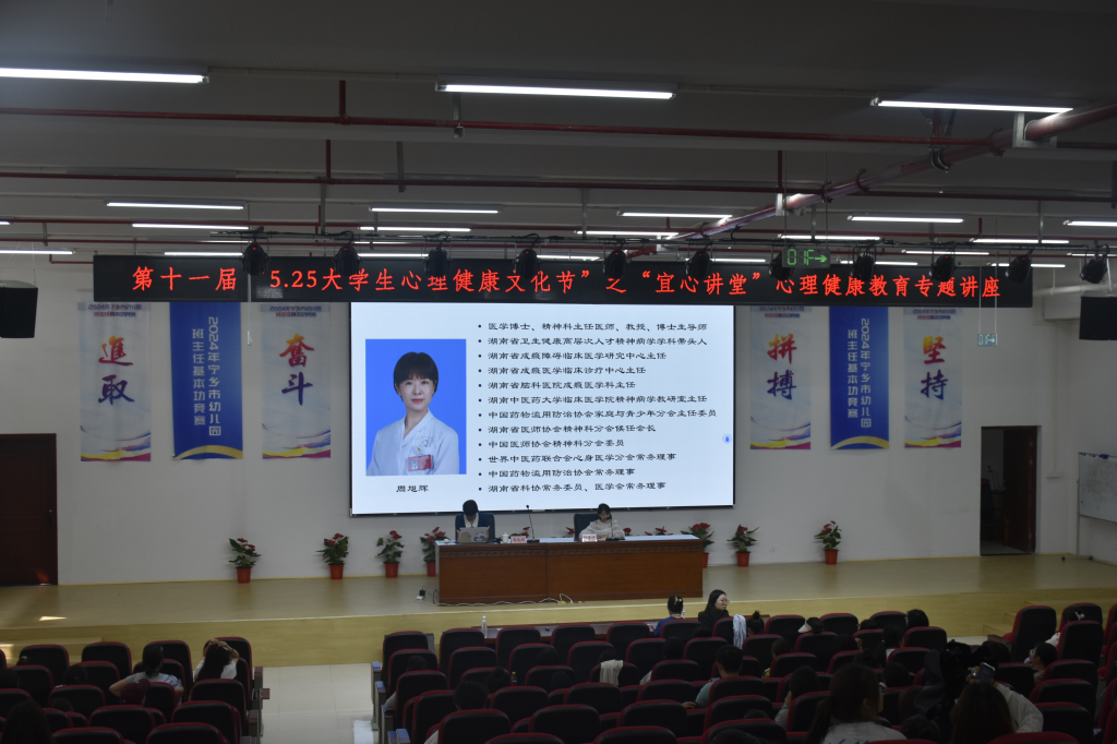 5月23日,我校举行第十一届“5.25大学生心理健康文化节”之“宜心讲堂”心理健康教育专题讲座,特邀湖南省脑科医院酒瘾网瘾科主任、博士生导师、医学博士周旭辉主讲。本次讲座主题为《如何好好谈恋爱——谈谈大学生恋爱心理》,由学生工作与安全保卫处心理发展中心的专任教师彭申珍主持,各班心理委员、宿舍联络员代表前来聆听。