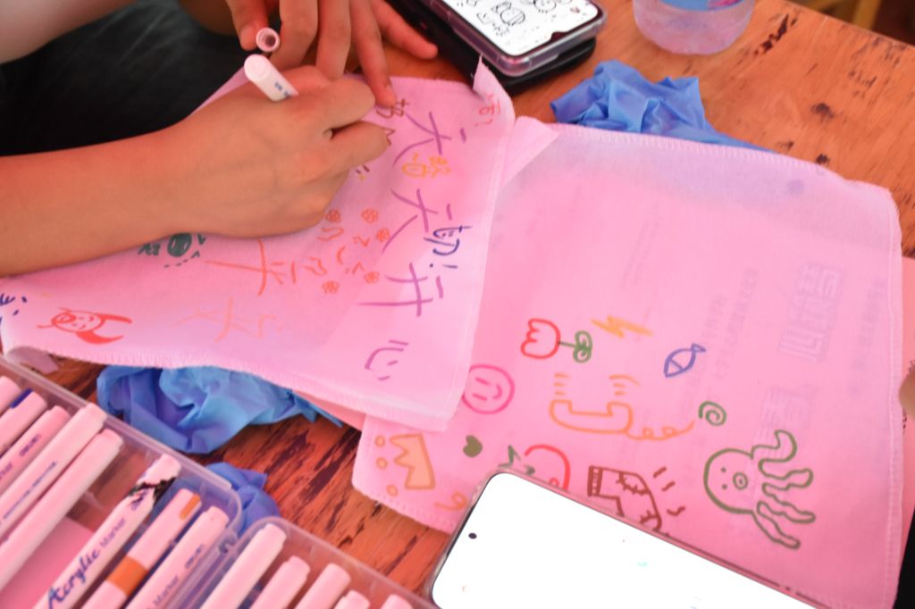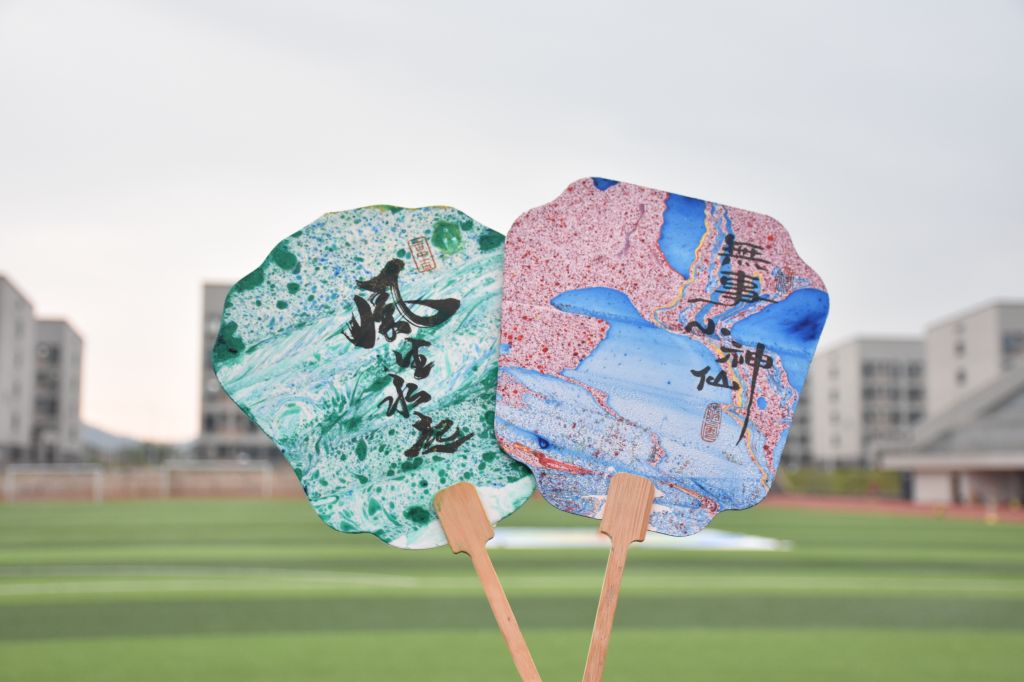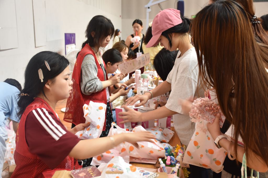 匠心手作铺专区,非遗技艺与创意DIY项目成为同学们心灵栖息的驿站。“古韵心染”扎染体验坊前排起了长龙,同学们在捆扎、浸染等工序中体验传统手法的独特韵味,也感受着心绪的舒展与释放。相邻的“扇舞风华”漆扇创作区,随着手腕幅度和力道的不同,每一把扇子都呈现出形态各异的纹理,同学们在创作中感受到“独一无二”的快乐。在“心绘帆影”DIY区,同学们用灵动的双手将心中的意象可视化,用艺术的语言诠释对生活的热爱。在“心意书签”制作区,同学们将干花与彩纸巧妙搭配,创造出独一无二的作品。有人将永生花拼成太阳图案,附言“心向光明”,有人用细绳缠绕出“平安”二字。完成的书签在镜头前定格,成为游园会珍贵的纪念品。