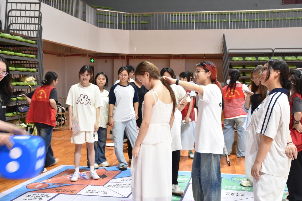 趣玩同心局打造知识闯关、推理游戏、压力释放等趣味活动,在游戏中培育积极心态。在“丢掉烦恼”摊位前,学生们有序排队,站在标记线后,用力将沙包掷向远处的目标区域,现场加油声、欢呼声此起彼伏。在“心理大富翁”摊位上,巨大的彩色棋盘铺展在地,学生们化身游戏玩家,通过掷骰子前进,完成各种有趣的挑战任务,在欢笑中学习心理健康知识。“谁是贪吃鬼”桌子旁,蒙眼投票环节充满戏剧性。有人故作镇定地咀嚼食物,有人偷瞄同桌表情试图“破案”,当小偷被揭穿时,全场哄笑伴着掌声响起。获胜者举着印章调侃:“下次要当演技更好的‘贪吃鬼’!”