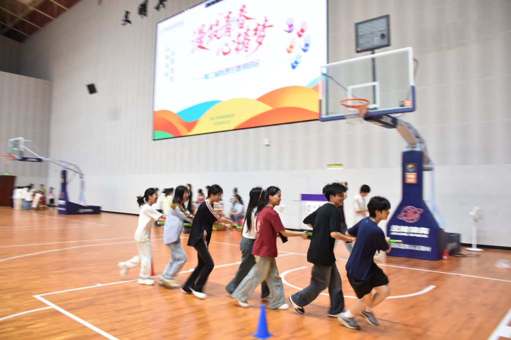 最具挑战性的“解锁心活力”专区则开设团体挑战,通过协作互助提升团队凝聚力,让同学们在欢乐氛围中收获友谊。在“鼓动人心”现场,大家齐心协力,喊着整齐的口号,让排球在鼓面上有节奏地跳跃。“杆上心程”挑战区则上演着平衡与信任的协奏曲。有人紧攥前方伙伴的衣角步步试探,有人在摇摇晃晃中爆发笑声,最终所有队伍都在相互搀扶中抵达终点,诠释着“盲区亦有光”的深刻寓意。“珠行万里”挑战现场,30米长的赛道上,半圆管如波浪般传递。有队伍因球体掉落集体叹息,随即调整策略加速奔跑;有队伍默契配合,球体稳稳落入终点杯子时,队员们击掌相拥,无论成败,每个人的脸上都洋溢着酣畅淋漓的喜悦。而在体育馆的一角,“环环心扣”项目中,学生们手拉手围成圈,将呼啦圈从一人手中传递到另一人手中,过程中大家相互配合,笑声连连,增进了彼此之间的信任与默契。