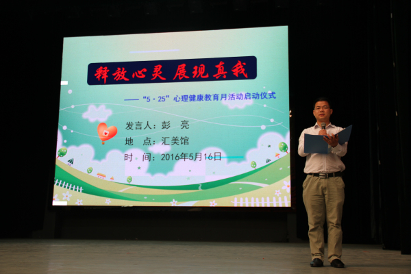 活动开始,彭老师简单介绍了“5·25”的由来以及“5·25”心理健康教育月的活动宗旨,提醒广大师生注意关注自我、认识自我、悦纳自我。只有这样,大家才能更好地关爱他人,关爱社会,实现社会和谐。通过一段往年的精彩片断视频,彭老师带着大家回顾了我校近几年来心理健康教育活动开展的具体情况,其中,“感恩蓝丝”、“心理沙龙”、“团体心理辅导”等最受广大师生的青睐。其次,彭老师用通俗的话语解读了“什么是心理健康”,即自己舒服,没有让别人不舒服。彭老师强调,心理健康教育的对象不仅包括学生而且包括家长和老师。为了中止父母的争吵,为了挽救父母的婚姻等,学生有时会通过主动制造问题行为(比如生病、逃学、甚至自杀等)来转移父母的注意力。表面上看,这是孩子的问题,实际上,孩子充当了家庭问题的替罪羊。由于教师劳动具有很强的示范性,假如一个班主任或任课老师出现了心理问题,势必会将自己的负面情绪带给学生,导致老师在处理学生问题时容易冲动、缺乏智慧甚至成为学生心理异常的导火索。所以,我们要重视并维护家长和老师们的心理健康。接下来,彭老师具体介绍了今年5·25心理健康教育月活动的具体安排,包括心理主题班会、心理健康讲座、团体心理辅导、现场心理测验与咨询、团体心理辅导和高考心愿与祝福墙等。最后,彭老师表达了对长信师生的良好心理祝愿,祝愿大家心坚若磐石,心韧若缆绳,心纯若水晶,心烈如火焰。
