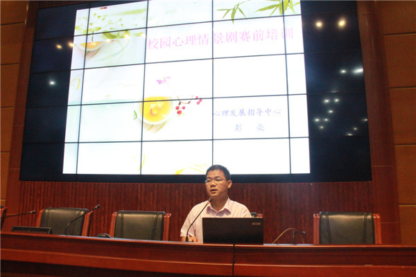 彭科长从校园心理剧开展的意义入手,指出校园心理剧是一种心理健康的宣传教育活动,是团体心理辅导中的一种表现形式;澄清了校园心理剧的概念——它是在心理剧的基本理论、技术的基础上,把学生中出现的心理困惑或问题搬上校园舞台,让学生自己表演、自己观看、自己体悟,从而使表演者和观看者都得到启发的活动;阐述了校园心理剧的特点及功能、要素及过程——校园心理剧有学习辅导功能、人际交往功能、情绪宣泄功能、心理适应功能、人格塑造功能等。他结合优秀的校园心理剧视频,重点为大家讲解了如何进行校园心理剧的创作——优秀校园心理剧的共同特点是什么、如何进行素材的搜集、剧本创作的要点是什么、心理剧技术如何运用。同时,他就校园心理剧大赛开展时间及人员安排、流程等相关事项进行说明,以确保校园心理剧大赛各项工作的有序开展。