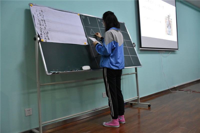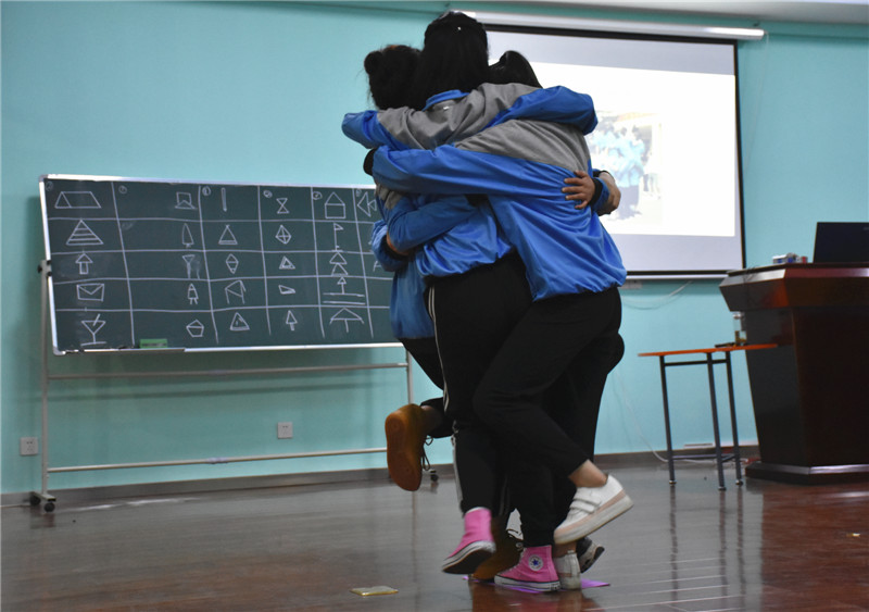 活动开始,简单的揉肩捶背小互动打破了学生之间初认识的拘谨与不知所措;同学们别出心裁、花样百出的自我介绍让大家迅速认识了彼此;老师的轮番提问与人椅游戏融洽了团体关系。选组长、定队名、口号、队形,迅速拉近了组员距离,为后续团队活动的顺利展开打下了良好的基础。“砖头花样多”、“三角形与三条线的故事”环节,同学们脑洞大开,讨论热烈,头脑风暴让全组紧紧地凝聚在一起。最后的“同舟共济”团体游戏将本次团辅推向了高潮。在最后的分享中,同学们纷纷提到,“我认为团结非常重要。”“不抛弃不放弃。”“只有互相团结,才能成功。”“没关系,我还可以坚持。”