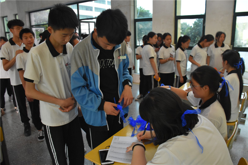 同学们排着队领取蓝丝带。