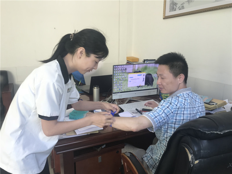 心理发展指导中心朱鸿博为音乐组雷小云系上蓝丝带,感谢雷老师对心理工作的支持。