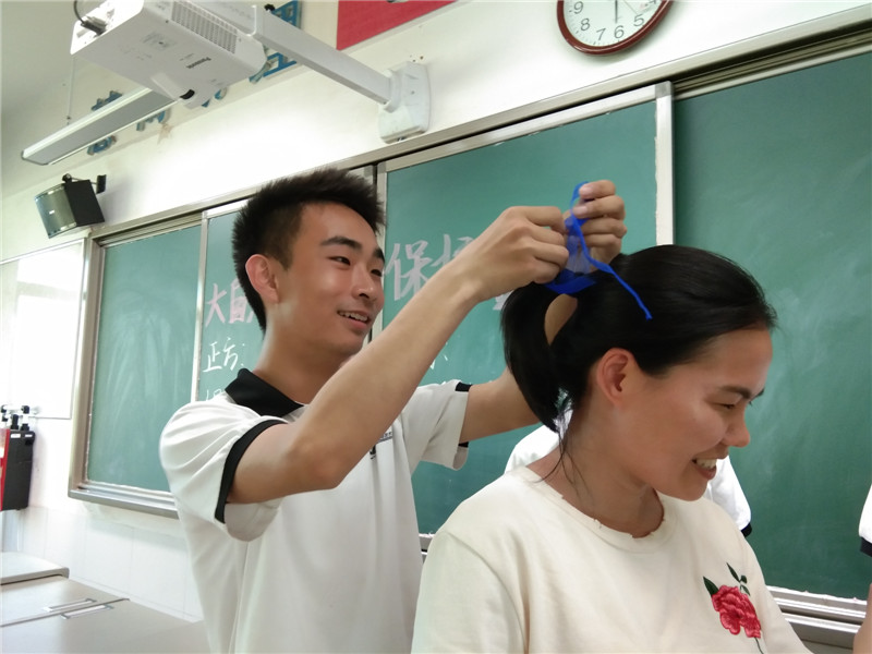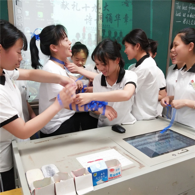 1607班同学为班主任肖琼老师系上蓝丝带,师生之情溢于言表。