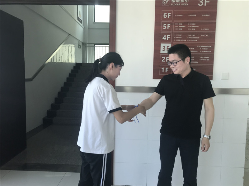 馨语社干事为学生科科长周曦系上蓝丝带,表示感谢并送出祝福。