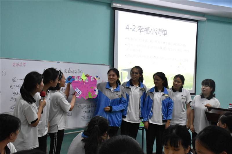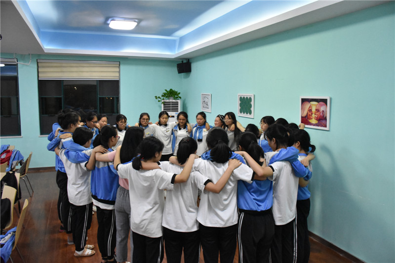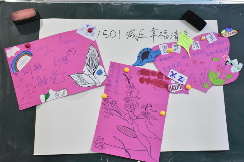 简单的热身游戏“身体按摩操”让同学们跳出了紧张的学习环境,拉近了师生、生生距离。挑战性“齐心人椅坐”活动促进了同学们之间的相互信任,同时让同学们懂得了集体责任感以及顽强意志力对达成目标的重要意义。通过“我说你来画”这个心理测验游戏,让同学们明白了:在完成同样一件事情时每个人所感受到的心理压力是不同的,因为观念与想法的不同,面对任务的压力也不同;不合理信念使得压力倍增,我们需要辩驳不合理信念,转变观念。“信任有个圈”活动增进了同学之间的信任,也让同学们明白了:面对压力无须独自面对,可以通过寻求同伴支持,从朋友身上汲取力量、获得支持。而在幸福清单环节,同学们学会了如何正确面对压力,掌握应对压力的实用方法。在最后的静默30秒与一句话寄语中,“愿你历经千帆,归来仍是少年!”“1501,你就是我的家!”“希望大家都能超常发挥,高考大捷!1501加油!”同学们热泪盈眶,热情高涨。随着《我相信》的旋律,大家拥抱在一起,为自己为朋友加油打气,获得支持与信心,一起冲向美好的明天!