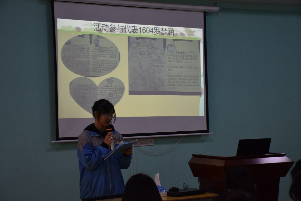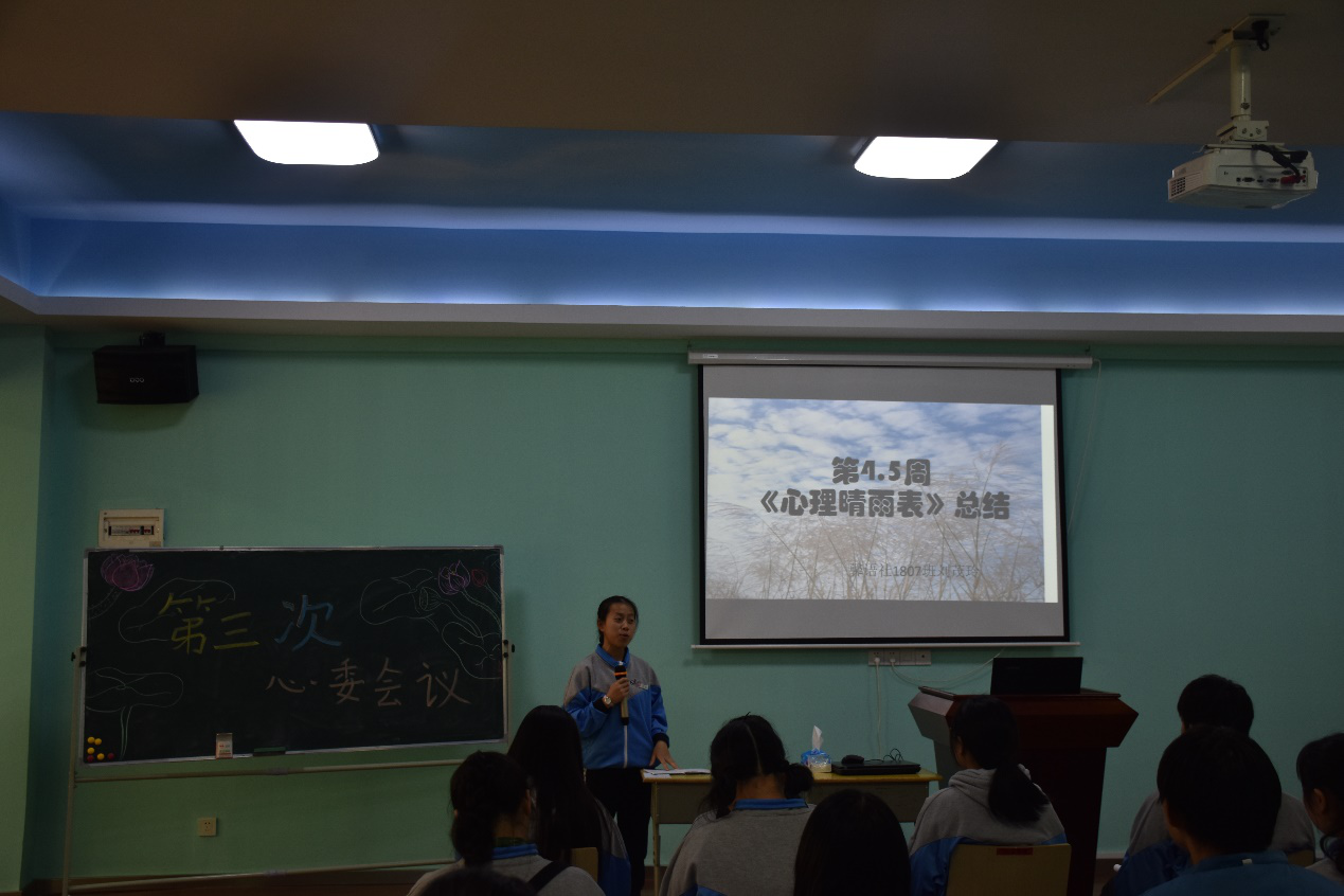 接着,刘茂玲对第4、5周《心理晴雨表》做了详细的总结,表扬了1603/1604/1605/16071705/1707/1710/1712/1713/1802/1804/1805/1806/1807等心委总结全面、工作负责。针对晴雨表反映出的班级同学不够自信、沉迷手机、家庭关系不良等问题,刘茂玲建议心委从“多与同学沟通”“学会放松”“求助心理发展指导中心”等方面帮助班级同学。