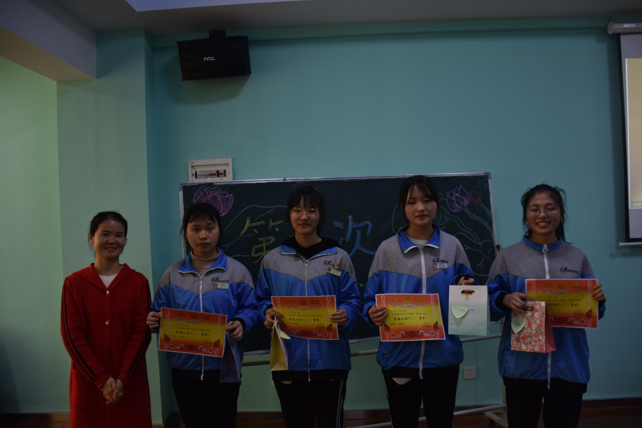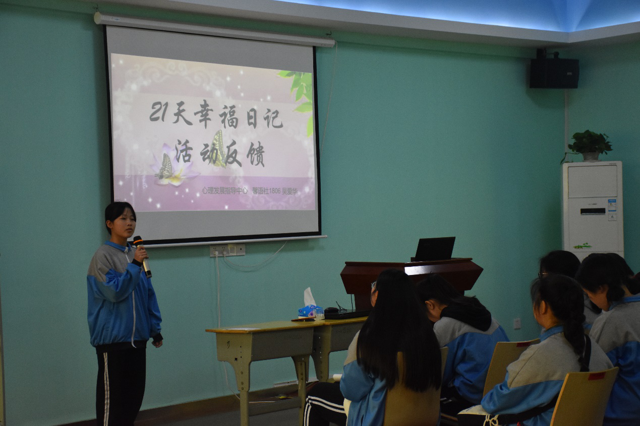 首先,由吴爱华总结21天幸福日记活动。在挑战情况和优秀日记展示中,我们看到了大部分心委认真参与活动的剪影。在活动参与代表发言中,1604罗梦涵分享到 “21天的挑战活动渐渐地让我成为了一个善于发现身边幸福的人”,1806易燕雨说到自己从妈妈的一句话“要细心发现生活,体会每一个小事情”中受到启发,开始认真地从朋友的关心中体会幸福,从父母的话语中体会幸福,从自己的努力中体会幸福,写完21天的幸福日记,才发现原来她一直都很幸福。在老师总结中,周老师展示了心委呈现出的部分幸福事件,总结 “幸福就是吃好、睡好、玩好”、“幸福就是有人关爱、有人记得你”、“幸福就是与家人相处的时光”、“幸福就是自己努力后的充实、满足、快乐”,并讲解了幸福感和心理健康的关系,希望各心委既要有发现幸福、享受幸福的追求,也要有创造幸福、传递幸福的情怀。在幸福日记活动评优中,吴爱华公布1803曹婉菁、1705黄心怡、1807唐思璇1714邓亚萍、1710周佳妮、1704叶钊智荣获三等奖,1702李思琪、1603廖恋 1707肖安、1804谌锐荣获二等奖,1605尹婷、1806易燕雨、1712王佳佳、1604罗梦涵荣获一等奖,周老师为一、二等奖的获奖者颁布了奖状和礼品。21天幸福日记活动虽然结束了,但我们追求幸福的脚步永远不会停止,吴爱华号召各心委在以后的日子里找到更多的小确幸,勇往直前地在生命中绘出一幅优美的水彩画。