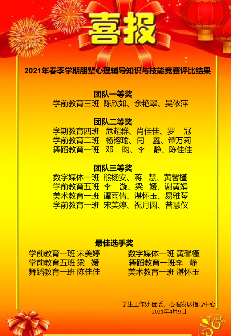 4月7日16:40,2021年春季学期朋辈心理辅导知识与技能竞赛在汇智厅开展,学工处处长彭繁珍、心理发展指导中心主任彭亮、团委副书记祝居里、各系部德育主任及心育专干、各辅导员及全体大一学生参加本次活动,评委是心理老师熊石林、蒋珊珊,活动由学前四班杨蕴憬、学前二班张雯音主持。本次竞赛由必答题、判断题、心理视频分析题组成三关心理知识和技能大比拼,8支参赛队伍赛前充分准备、赛中精彩比拼,最后角逐出团队一等奖1个、团队二等奖3个、团队三等奖4个、最佳选手奖6个,彭繁珍、祝居里分别为其颁奖。赛后,彭亮进行了活动总结,他在感谢学校、各系、各辅导员、各参赛队伍的支持和付出后,希望此次活动犹如一粒种子,在参赛队员中播下助人自助的朋辈心理辅导力量,在观众中播下关爱心理、走进心理的心理健康意识,助力和谐校园的构建。