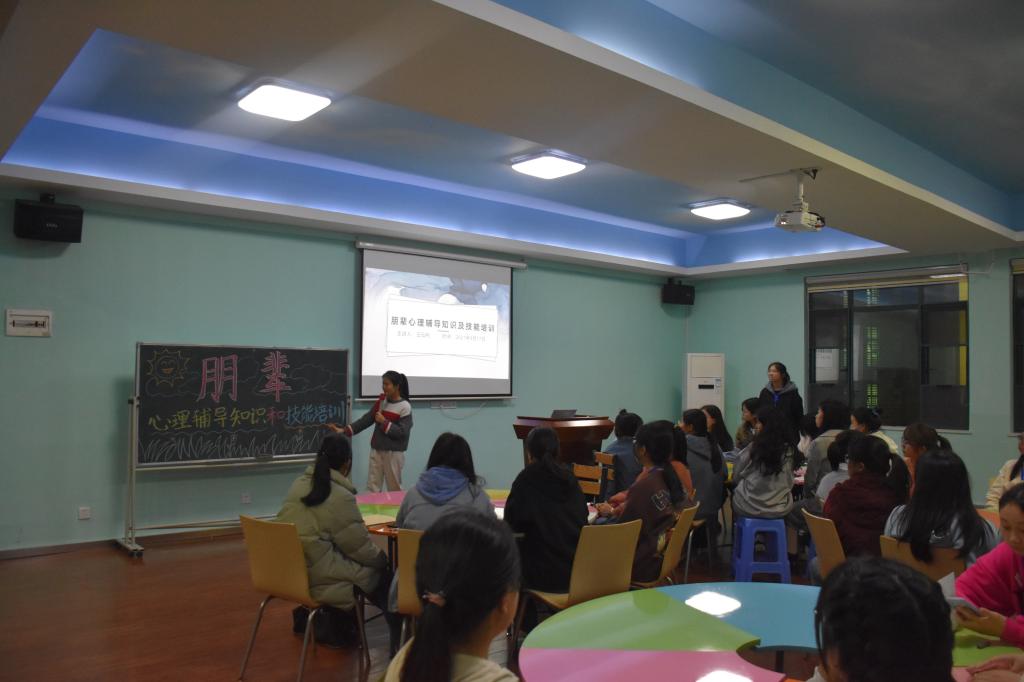 4月1日18:40,各班心理委员和4名寝室长在心理发展指导中心成长厅参加了第二次朋辈心理辅导知识与技能培训,培训由学工处心理健康专干周威主讲,校心理部完成培训组织工作。在轻松愉快的一个半小时中,大家通过团体辅导活动对朋辈心理辅导的相关知识和技能有了更深层次的认识和体验。