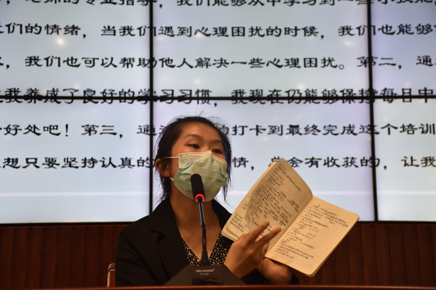 会议伊始,2021年荣获朋辈心理辅导知识网络培训“优秀学员”的两名代表作了经验分享。 20级学前教育2班谭万莉分享到:参与这个活动让自己收获了很多有关朋辈心理辅导必备的基础心理知识,而这些知识同时对于自身成长也是很有裨益的。她还特有成就地展示了自己当时的学习笔记,感叹自己现在仍在坚持的摘抄学习习惯就是起始于该活动。20级学前教育4班肖佳佳在分享中坦承自己曾遇到过心理困扰,试着寻求心理老师的帮助,可面对老师还是会有压力感,很多事情都无法顺利说出口,而此时身边的朋友给予的帮助让她能够敞开心扉,解决了自己的心理困惑。 所以,她说“即使牺牲一定的时间去了解朋辈辅导也是值得的。”她表示,她会把在培训中学到的朋辈心理辅导知识与技能应用于生活和工作实际,不管是关心同学,还是帮助自己。接下来,21级视觉传达一班雷彩云通过一段小视频再加上详细讲解,让同学们明白了具体的学习步骤。为营造良好的学习氛围,保证大家积极参与到学习中,校心理部部长20级学前教育4班王仙利为大家解说了本次培训活动的过程性考核要求以及优秀学员的评比条件。最后,周威对此次活动进行总结。她表示,求助是强者的行为,我们不仅要学会求助,也要热心提供自己力所能及的帮助,其中就包括在我们的工作中积极开展朋辈心理辅导工作。她希望通过此次活动,大家能掌握到基本的朋辈心理辅导知识并积极应用于自己的工作和生活中,帮助自己、成就自己、提升自己。