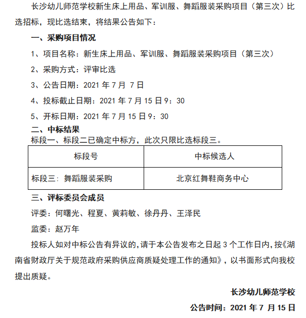 新生床上用品、军训服、舞蹈服装采购项目(第三次)中标公告