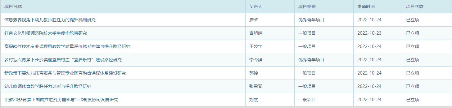 依据《关于公布2022年湖南省教育厅科学研究项目立项结果的通知》(湘教通〔2022〕323号),我校申报的7个研究项目(一般项目5项、优秀青年项目2项)全部成功立项,特别是2个优秀青年项目立项率高达100%,是我校参与省教育厅竞争性科研项目申报的新突破🚶🏻♀️➡️。