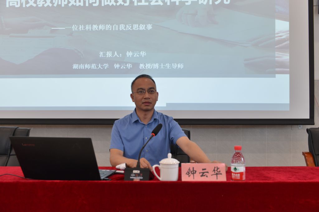 为进一步营造学校科研学术氛围,激发广大教师的科研积极性,提升科研能力,6月30日上午,我校举办了以“高校教师如何做好社会科学研究”为主题的专题讲座。本次讲座由湖南师范大学教育科学学院钟云华教授主讲,我校副校长文孟飞出席培训会议,全校教职工参加培训,会议由科研处处长何曙光主持。