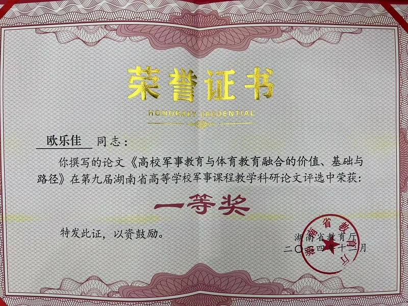 2024年12月25日至27日,湖南省高等教育学会第十二届国防教育专业委员会2024年年会暨第九届军事课程教学科研论文报告会在吉首成功举办。经专家评审,我校学前教育学院体育教研室主任欧乐佳撰写的《高校军事教育与体育教育融合的价值、基础和路径》荣获湖南省教育厅论文评比一等奖。并代表学校在湖南省高等教育学会国防教育专业委员会年会上做专题分享。