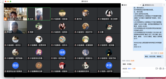 艺术学院2022年入党积极分子第五组于2022年12月12日晚上20:30,第六组于2022年12月12日下午15:30,召开线上入党积极分子主题研讨会(第一阶段),参会人员有唐艺芸,陈娟,汪英琦,何云,肖灵雅,屈雨欣,罗诗雨,雷彩云,尹萍,文菁,唐思璇,罗滋滋,段玉婷,刘枝,贾岸清,罗彩翼,李湘,李贞、王晓琴、刘羽嫣、毛豫典、彭思雨、覃基炜、刘家文、何苏玲、曾欢、王溢、刘丹丹、彭宇华、彭艺铭、刘阳、周彩、邓颖、唐一菲、易雅琴、谭雨倩、王宁、梁珊、廖文卓、潘欣,主持人是唐艺芸和王晓琴。