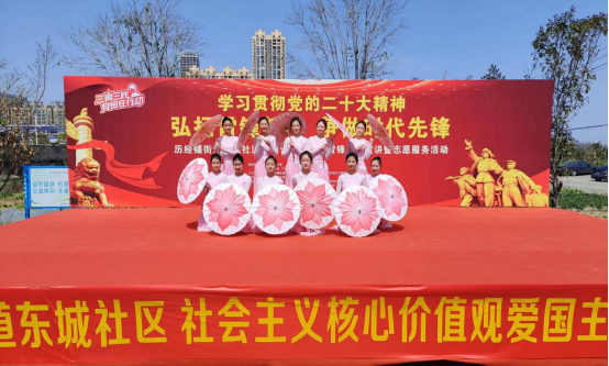 2023年3月5日下午14:00,艺术学院党总支书记伍莉、副院长戴申林、党总支委员刘燕、德育干事刘智勇及二十名学生等青年志愿者来到历经铺街道东城社区进行公益演出,助力社区党团合力开展学雷锋主题宣讲暨志愿服务活动。由18表班、21级舞蹈表演班彭艺、黄甄、鲍欣怡、胡蝶飞、周蓉等十二名学生带来的舞蹈作品《莲》,从湖湘文化中汲取营养,结合我校办学历史和办学特色,弘扬清廉文化,以“凌波仙子静中芳,也带酣红学醉妆”的唯美画面,舞蹈演员们宛如一朵朵莲花,美丽又清新;由22级舞蹈教育二班米寅锋带来的舞蹈作品《草原随想》,其浓郁的情感与喷薄的力量完美结合,艺术学院推送的两个舞蹈作品获得了在场观众的高度认可,为本次活动增添了一道靓丽的风采。