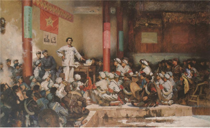 樊荣老师将历史大背景下的党史故事和油画中经典作品结合,回顾了建党伟业、秋收起义、南昌起义、井冈山会师、红军长征、抗日战争、解放战争等红色历史,介绍了《五四运动》、《启航》、《血战湘江》、《开国大典》等32张油画作品,从思想的高度和美术专业的层面,不仅让师生们重温了党史,更汲取了奋进的力量,明了责任与担当。