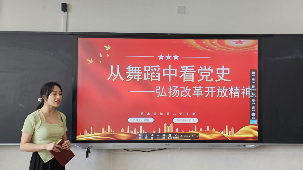为进一步贯彻习近平新时代中国特色社会主义思想,弘扬伟大建党精神赓续党的红色血脉,引导艺术学院全体党员将理论学习转化为指导教育教学工作的强大动力。4月20日下午,艺术学院全体党员在艺馨楼开展“从舞蹈中看党史”主题党日活动。艺术学院第二党支部书记何婷作为主讲人,将舞蹈作品的创作发展与中国近现代史中的改革开放精神相结合,从舞蹈中看党史,讲述改革开放时期的舞蹈发展历史。活动由艺术学院党总支书记伍莉主持。