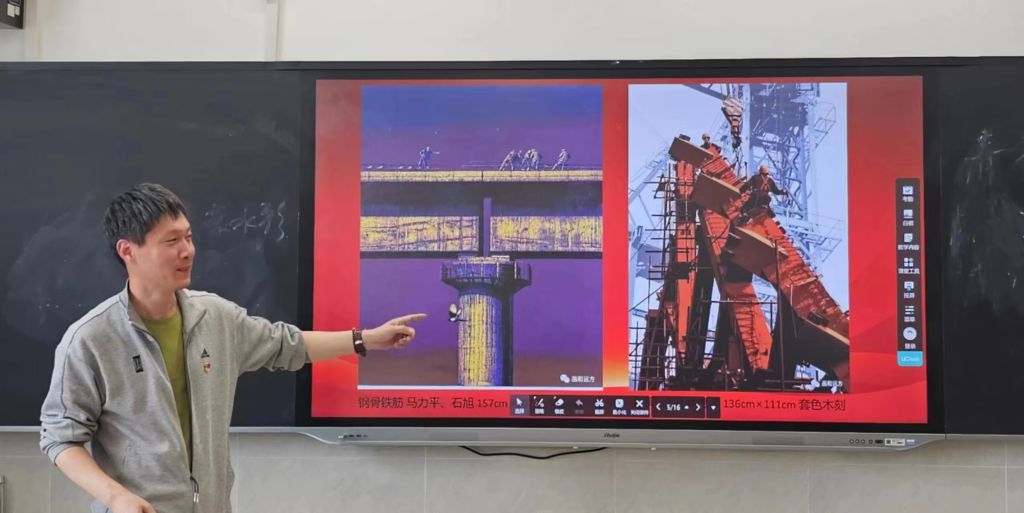 然后,尹老师将版画作品的发展历史与中国共产党的“四史”结合,娓娓道来。版画发展的历史可以概括为三个阶段,尹老师分别选取了三个阶段的优秀作品向在座的各位党员同志讲述了中国共产党的“四史”。中国共产党为人民谋幸福、为民族谋复兴、为世界谋大同的实践史,中国共产党的领导是“四史”的主线。这些内容在版画中均得到了很好地体现。中国的综合国力蒸蒸日上,人民物质文化生活不断得到满足。版画作品也由以往的关注中国苦难史向关注现实问题转变。