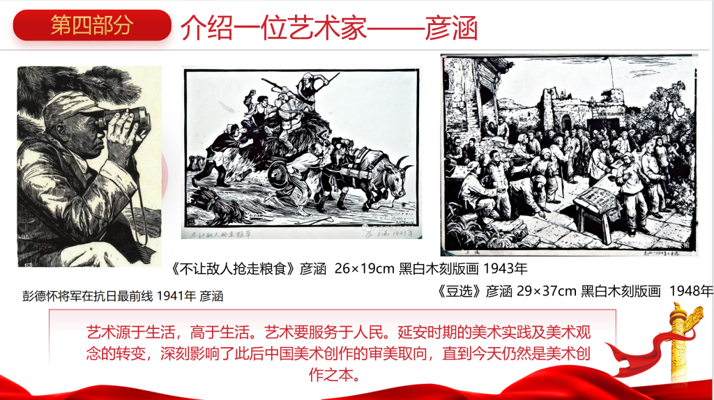 此外,陈泓安还深入解读了鲁艺师生在战火纷飞的岁月中如何为抗日救亡事业贡献自己的精神力量。她特别指出,木刻版画如何在艰苦的环境中就地取材,成为了解放区的艺术利刃。通过赏析那些经典作品,我们得以深刻领略到艺术家们的独特艺术风格和强烈的责任担当。