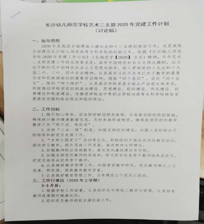 支部书记李伟强同志首先向全体党员同志传递了学校党委的相关会议精神⚗️,进一步深化思想认识👆🏿,在疫情防控、复工复产、本职岗位中勇担重任😫,落实全面从严治党和党风廉政建设,加强师德师风建设等。随后,李书记与全体党员同志就2020年艺术二支部年度工作计划(讨论稿)进行讨论🧶,全体同志一致认为该计划结合了学校党委的年度计划、学校工作与本专业的相关特点、重点突出🪥🤽🏿♀️。