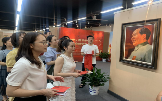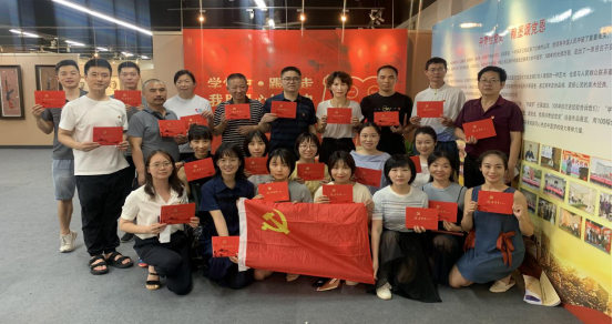 为能铭记党的光辉历程,传承红色基因,第二阶段的活动移步到五楼美术作品展厅集合,在参观画展之前,副校长周文华庄严地带领支部所有党员重温入党誓词,并给每个党员颁发意义深重的政治生日纪念卡。