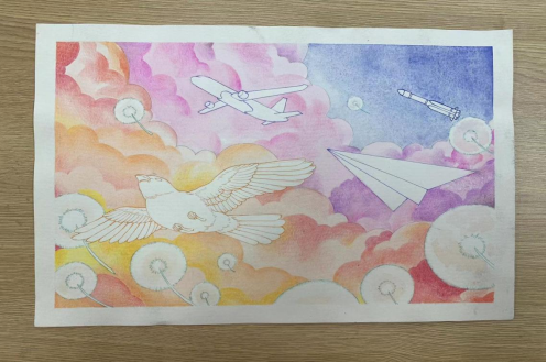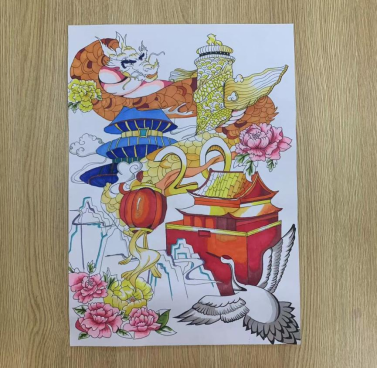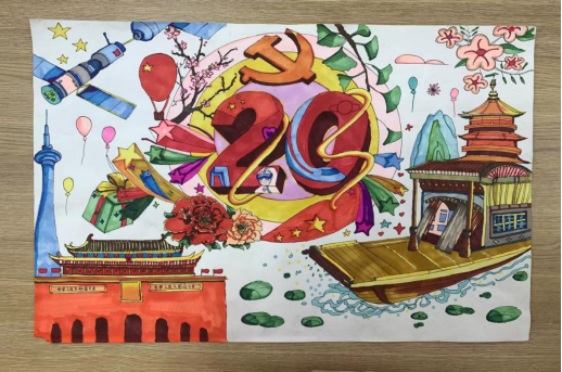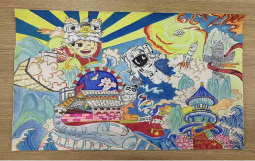 作品简介:青春献礼党的二十大、强国有我新征程;本幅作品中采用了中国颜料,运用了渐变、其中天安门是新中国的象征,中国吉祥神兽象征着平安,是智慧和力量的象征,航天,飞机,火箭代表着突破、勇气和探索精神,奋进新时代!其中有绿水青山、贯彻“绿水青山就是金山银山”的理念、推进生态文明建设、喜迎党的二十大,凝心聚力新时代立足中华文化深厚资源,创造性发展,全面多元彰显中华文化之美!