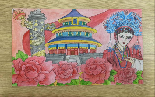 作品简介:我国国粹戏曲和天坛还有华表柱相结合,希望祖国越来越繁荣昌盛。