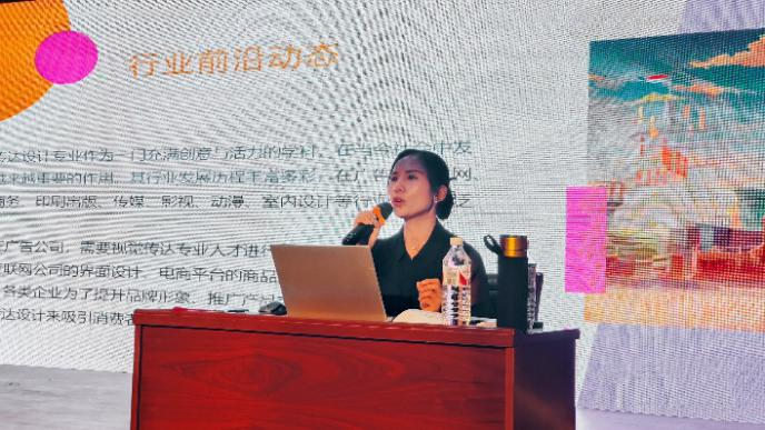 讲座还邀校企合作代表湖南源设动漫设计有限公司罗海燕来分享专业前沿动态与学习建议,详细介绍了专业对应的行业、岗位及薪资待遇,吸引了众多新生参与。以及介绍该专业在广告、互联网等行业广泛应用,行业前沿动态包括 AI 与机器学习融合、VR 等技术拓展、设计理念更新等。她用自己的亲身经历,讲述了在职业发展中的奋斗故事、收获的成长与喜悦,激励着新生们勇敢追求自己的梦想。