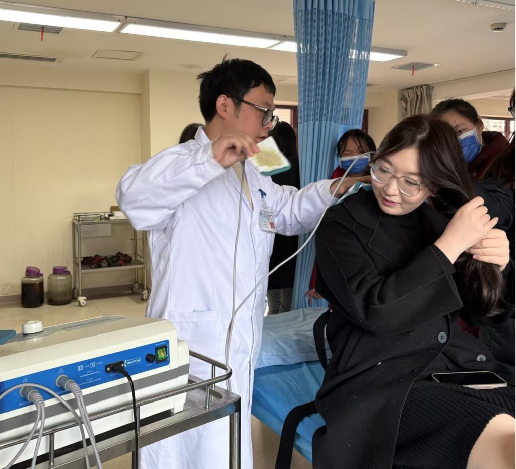 最后,同学们走进中医治疗区域,亲身体验了针灸、正骨、把脉、电疗等项目。在专业医师的指导下,他们了解到中医传统疗法在老年康养中的重要地位与作用,思考着如何将音乐治疗与中医理疗有机结合,发挥出更好的治疗效果,探索传统医学与音乐艺术在养老康复领域的多元融合路径。