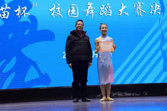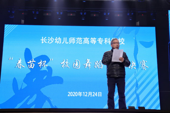 艺术系主任伍莉致辞,预祝此次“春苗杯”校园舞蹈大赛顺利进行,并宣布决赛正式开始。