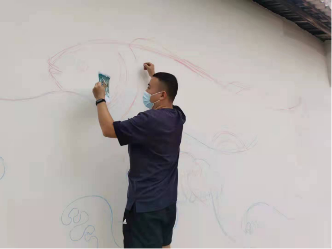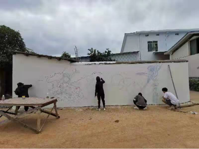 上图:前期准备已经做好,师生们在粉刷一新的墙面上起稿