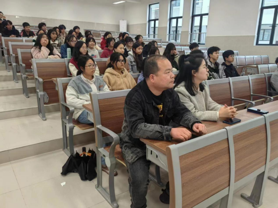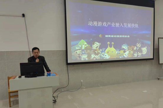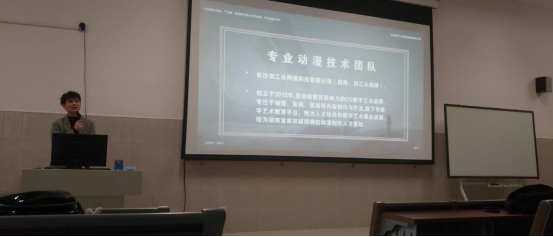 尹明飞老师向各位介绍了讲座嘉宾,并先邀请湖南省动漫游戏协会副秘书长杨智向各位同学和老师讲解了近几年动漫行业的发展走势与取得的成绩,并详细分析了多组动漫及其相关产业的经济数据攀升情况,证明了行业发展的大好趋势,然后向大家介绍了国家和湖南省对动漫行业发展的政策支持,并激励同学们定好目标、好好学习,在动漫行业发展一定大有可为。