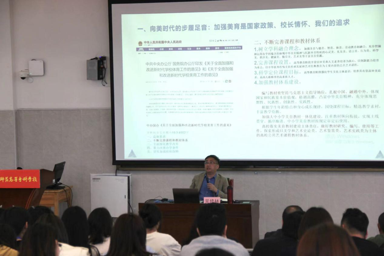 吴教授以《高校美育体系构建的思考,探索与实践》为题,以音乐教学和活动开展,给我校师生梳理了学校美育工作实施思路。吴修林教授围绕三个方面阐述美育教育工作的经验与总结。第一个主题为《高校美育体系构建的思考,探索和实践》,其中深刻讲述了美育理想与情怀追求,教育教学活动与创意以及文艺初心与湖湘案例。第二个主题为《校园美育的创意设计》,谈到了美育教育的机构机制,规划设计,课程改革,活动创意。第三个主题为《美育前行的文艺力量》,吴教授以湖湘文化为例,阐述了文艺讲话的精神力量以及其在美育教育中的重要作用。