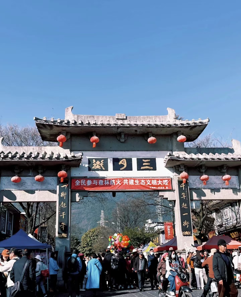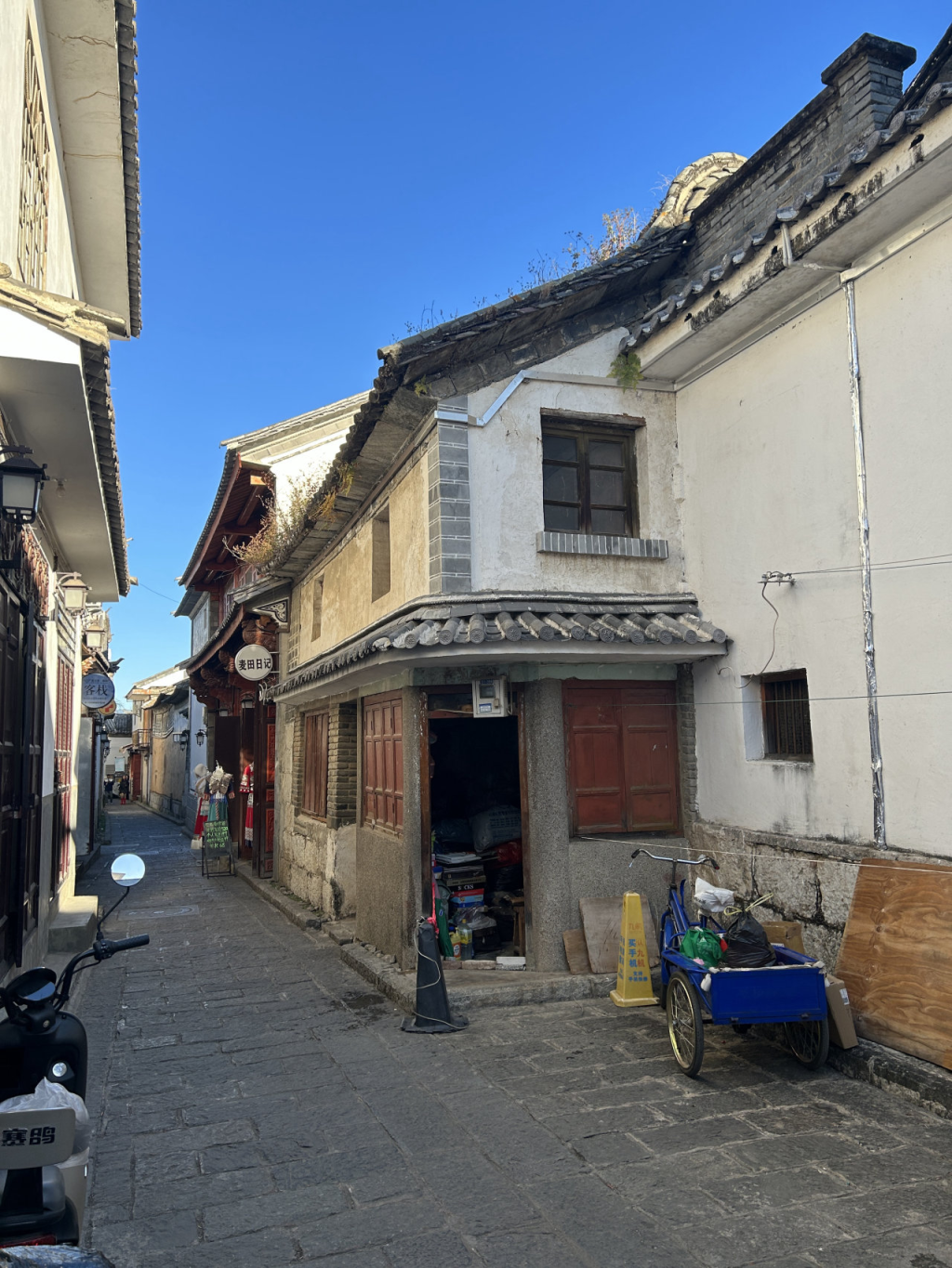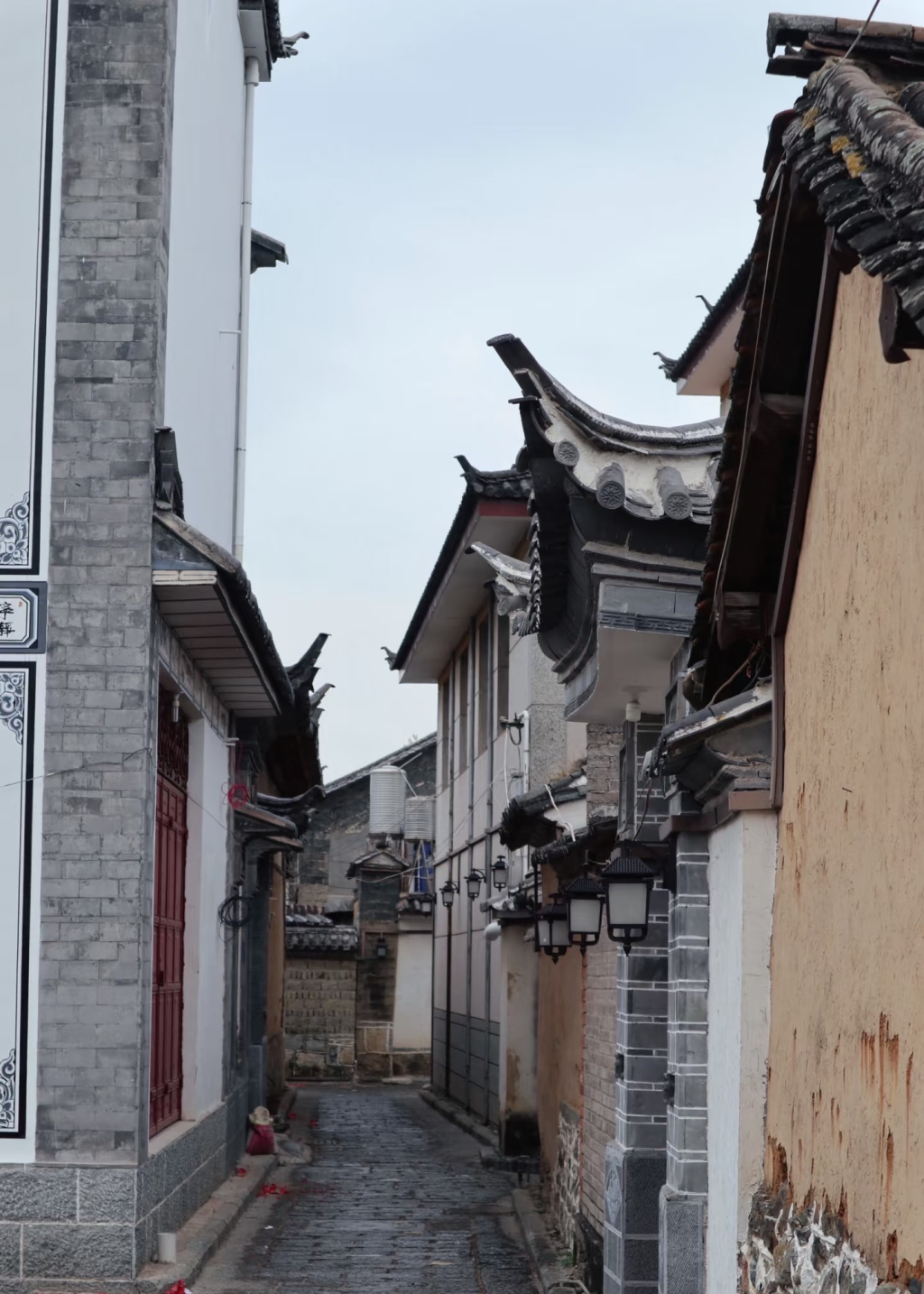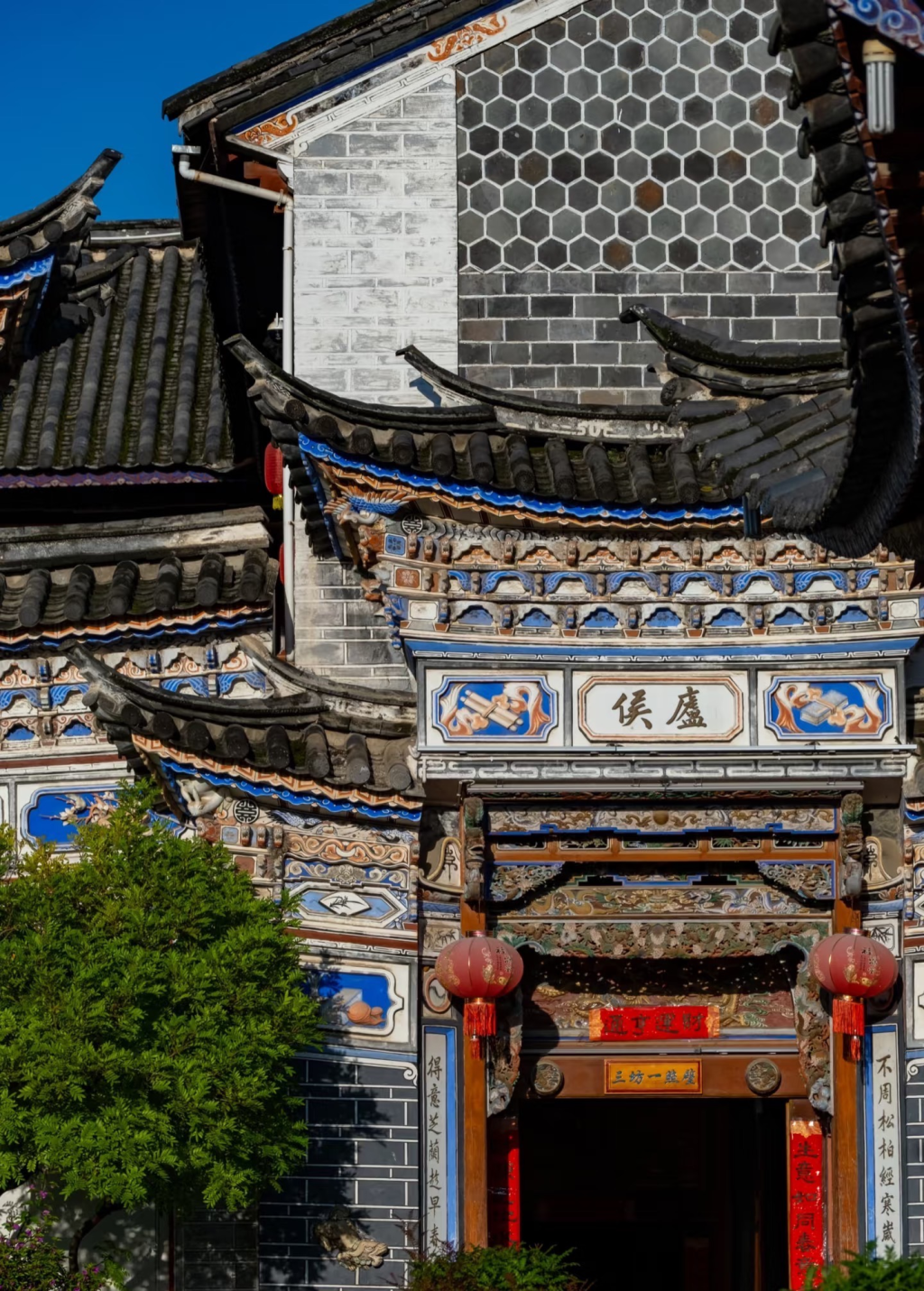 古镇的楼墙沐浴着阳光,树影婆娑舞