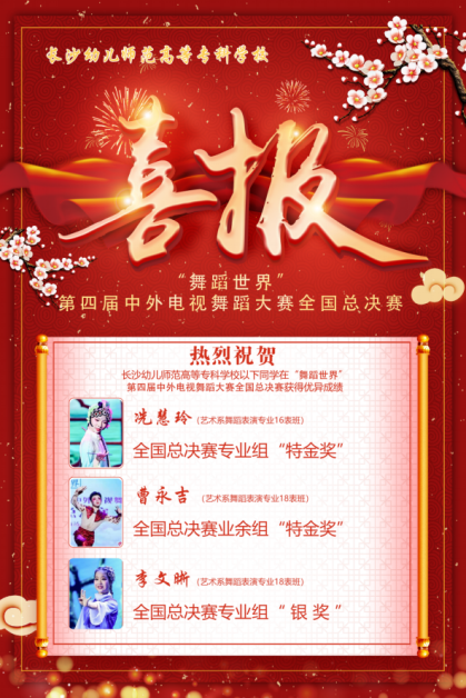 5月2日我校艺术系舞蹈表演专业冼慧玲(16表班)、曹永吉(18表班)、李文晰(18表班)三位同学在“舞蹈世界”第四届中外电视舞蹈大赛全国总决赛中分别荣获专业组“特金奖”,业余组“特金奖”,专业组“银奖”。此次赛事的指导老师为李剑、唐诗老师。