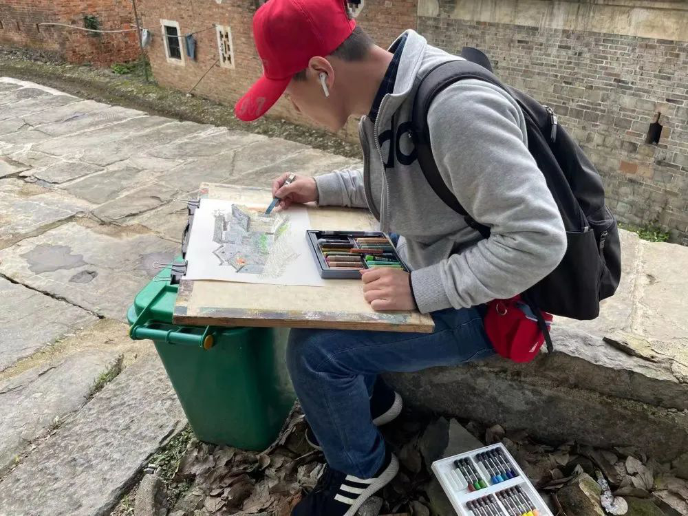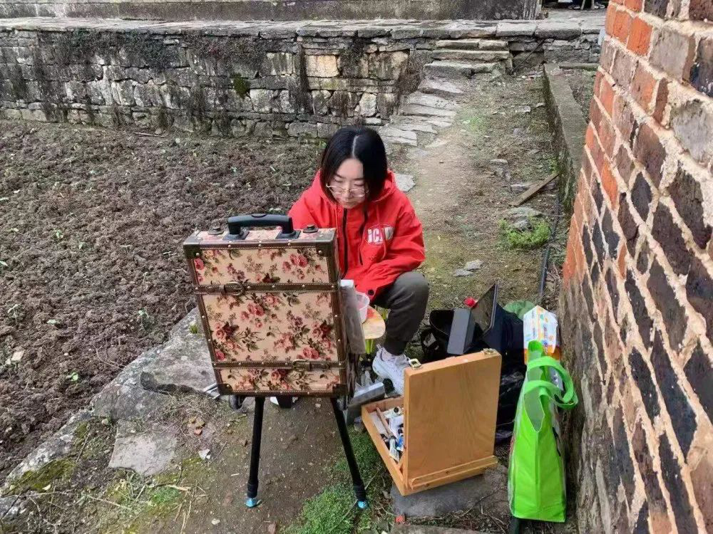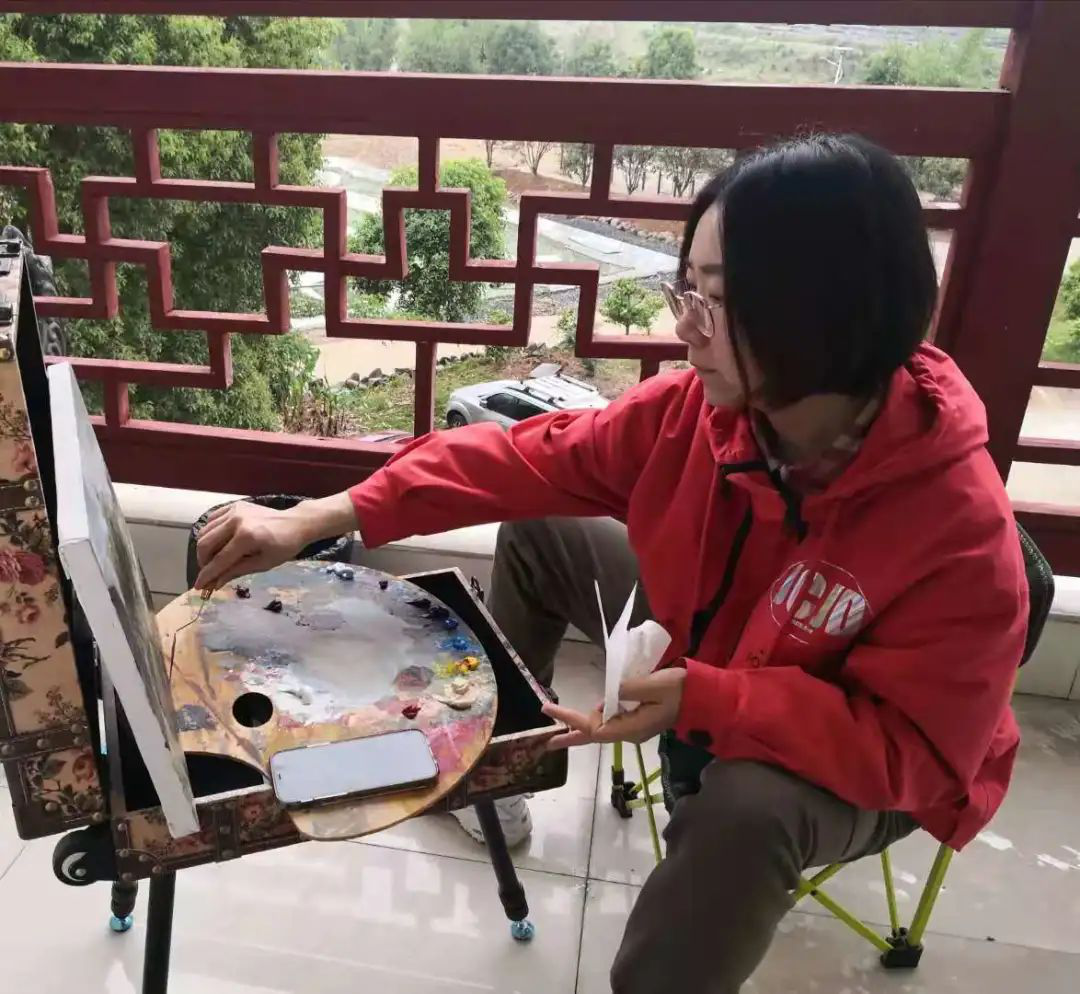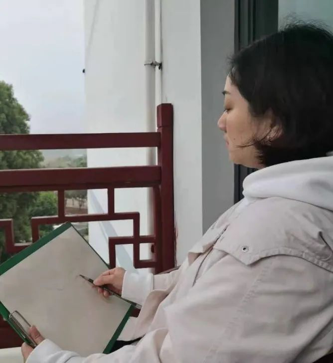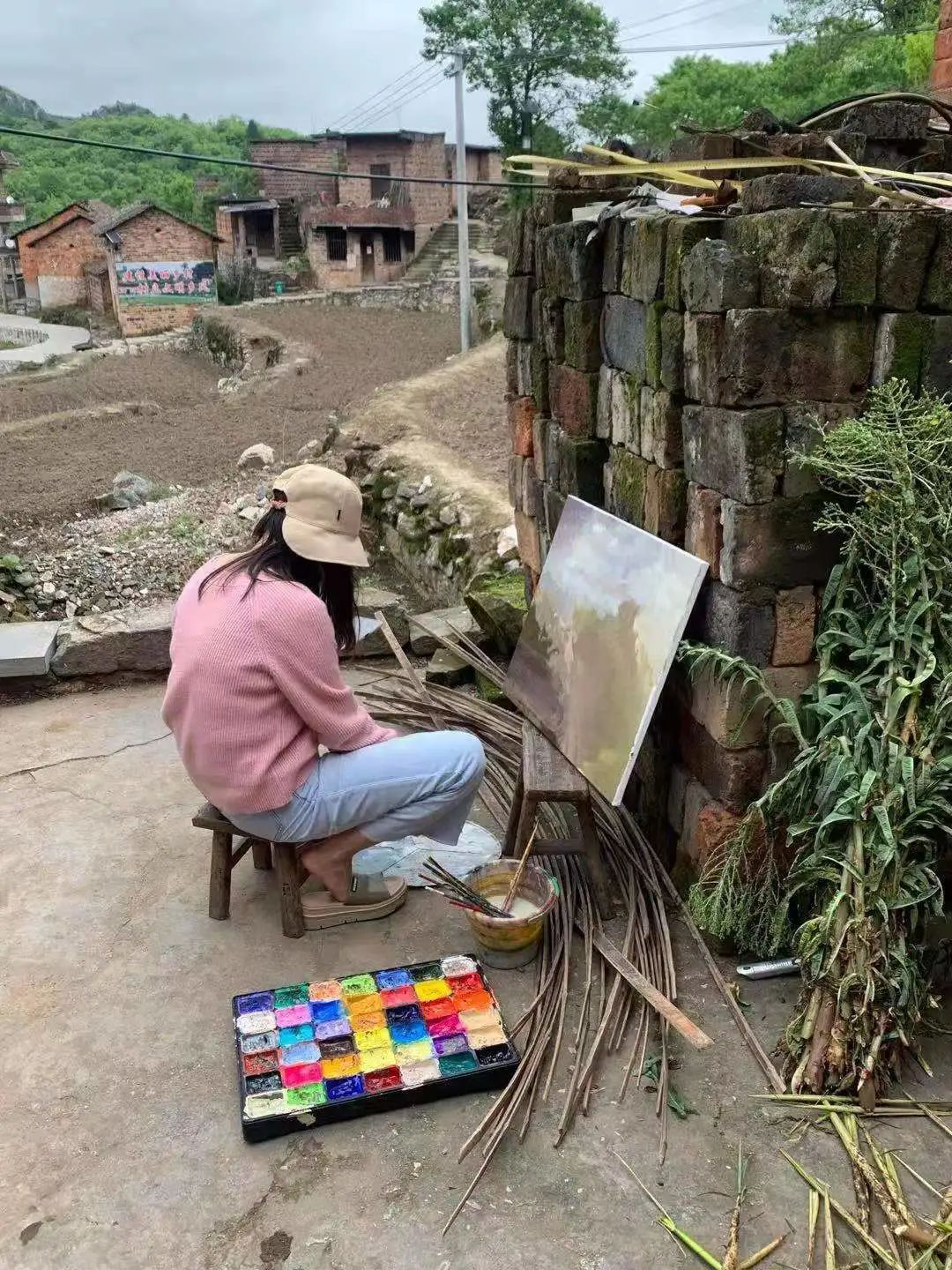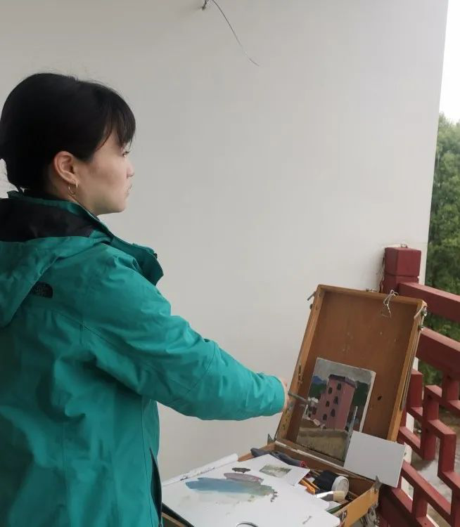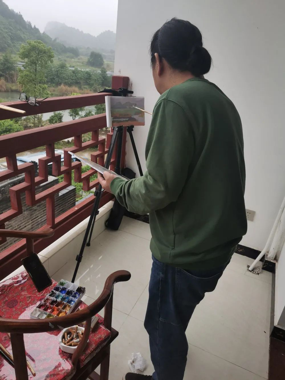 老师们第一个写生点---民风淳朴的小桃源村。在白墙黑瓦的民居楼下,不时有村民挽着裤腿牵着耕牛走过。初春的嫩芽刚刚从树梢抽出,寒气还没褪去,教师们纷纷拿着绘画工具走进山村,用自己的画笔将小桃源村的美好定格。25日一整天,老师们与画板为伴,沉浸在写生中,傍晚时分才回到写生基地。26日,由于当地暴雨,教师们选择在写生基地写生创作,在阳台、门廊里将雨中美景呈现在画面上。
