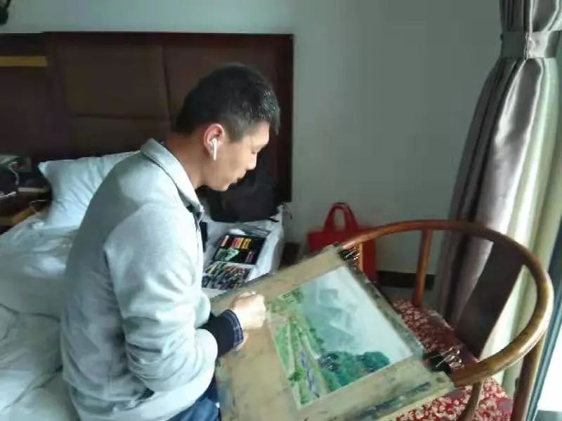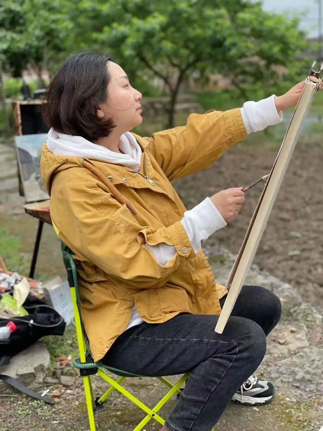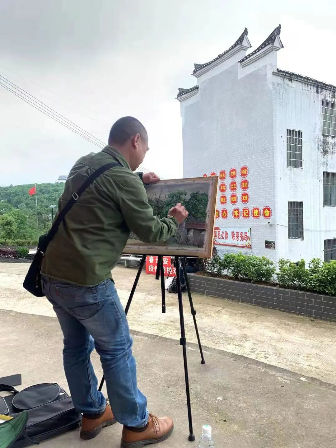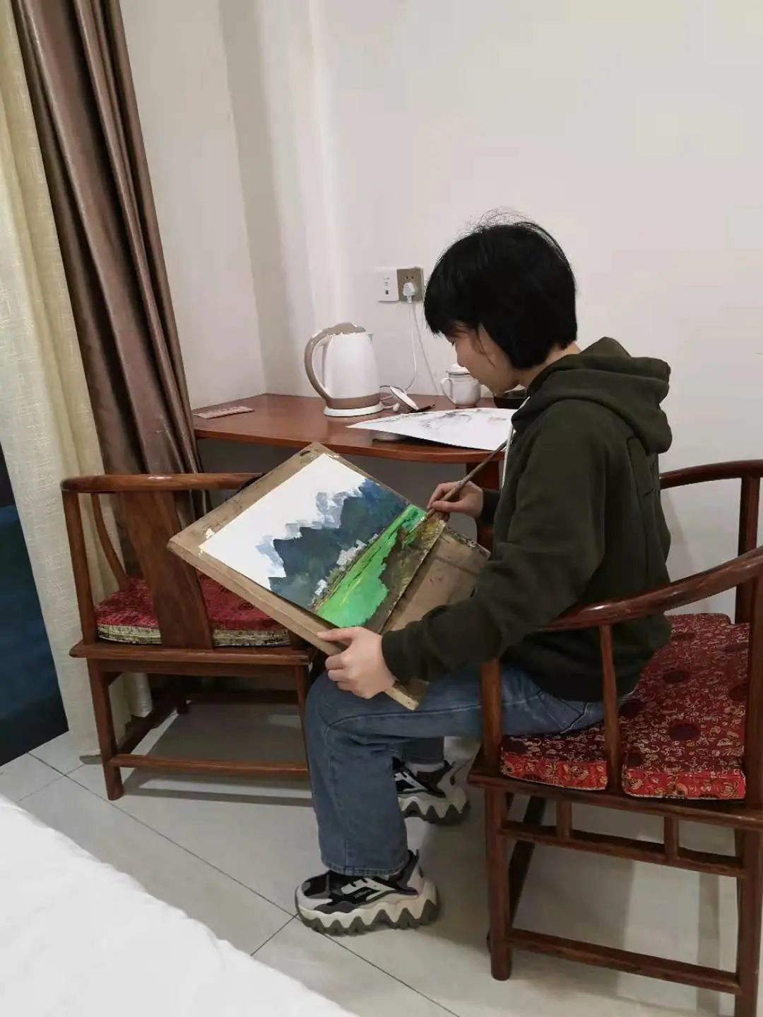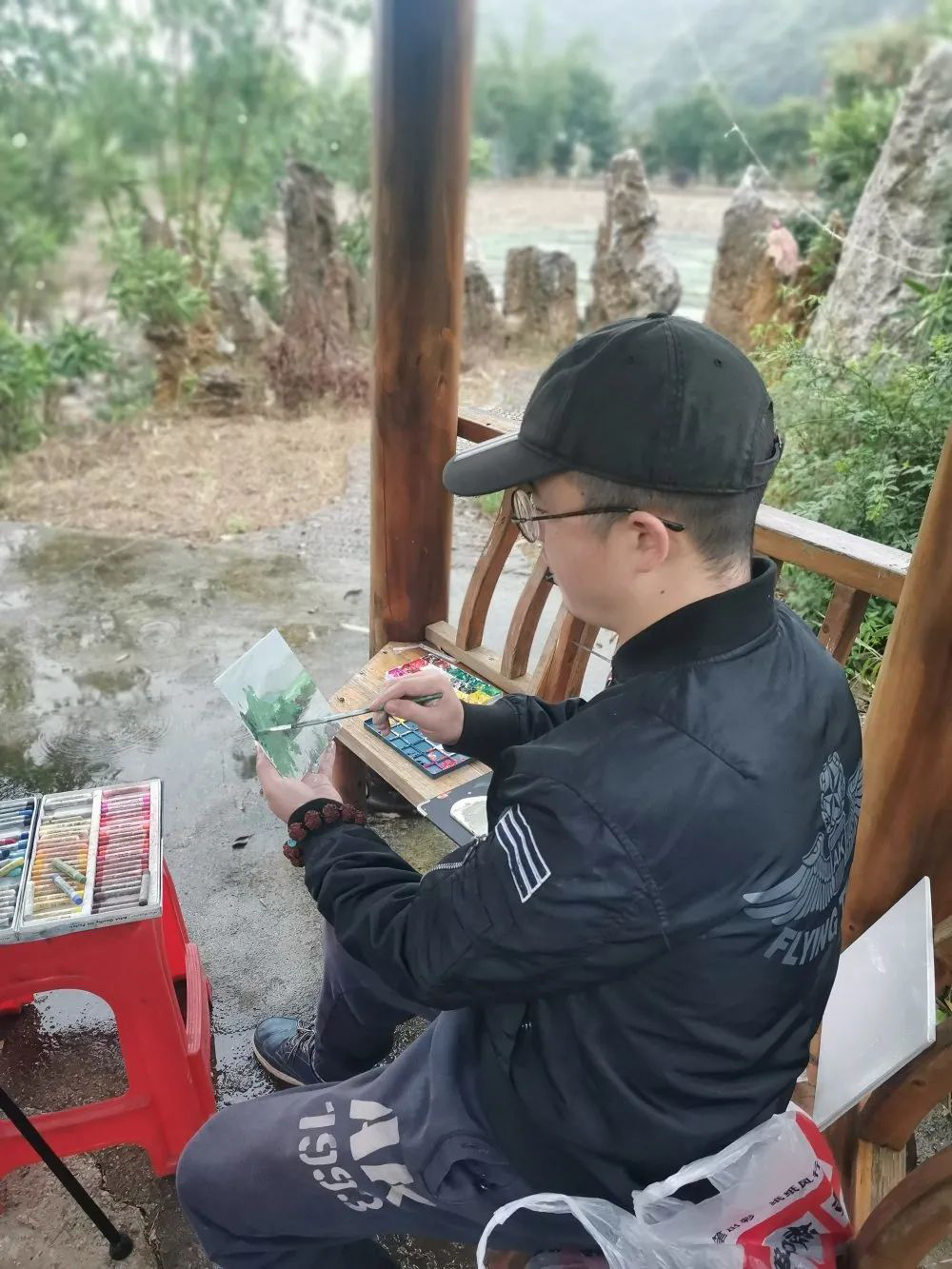 老师们第一个写生点---民风淳朴的小桃源村。在白墙黑瓦的民居楼下,不时有村民挽着裤腿牵着耕牛走过。初春的嫩芽刚刚从树梢抽出,寒气还没褪去,教师们纷纷拿着绘画工具走进山村,用自己的画笔将小桃源村的美好定格。25日一整天,老师们与画板为伴,沉浸在写生中,傍晚时分才回到写生基地。26日,由于当地暴雨,教师们选择在写生基地写生创作,在阳台、门廊里将雨中美景呈现在画面上。