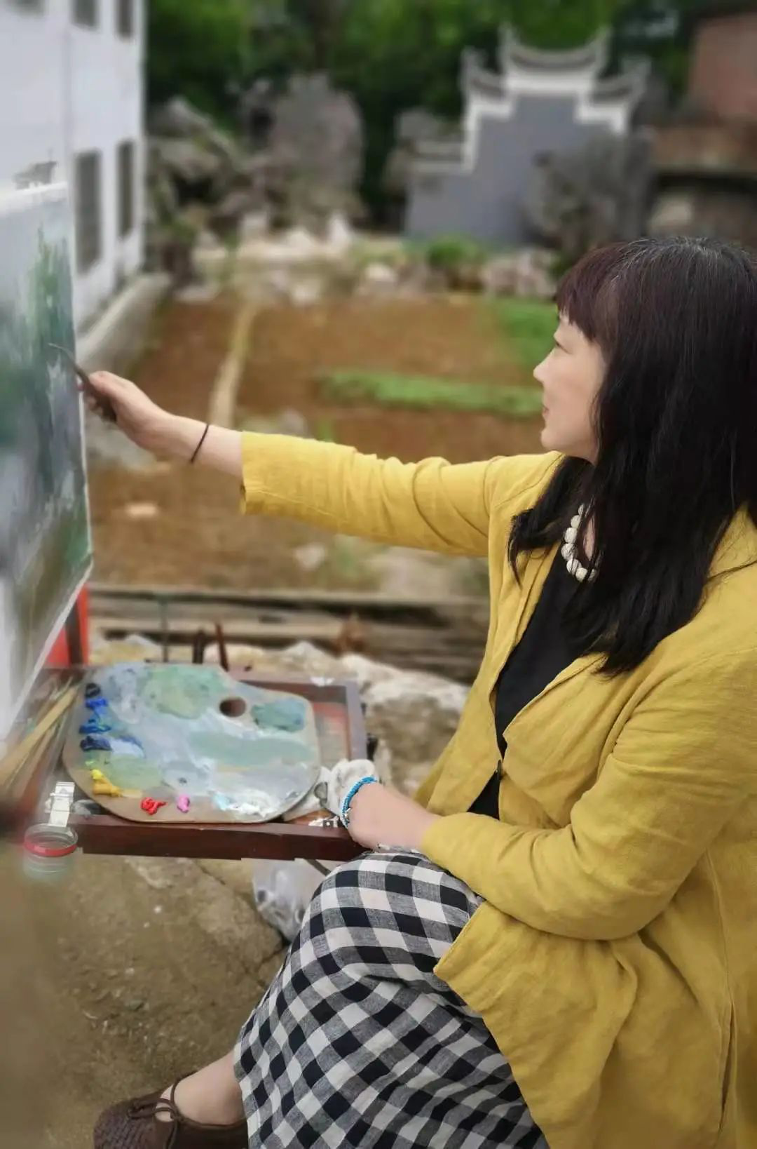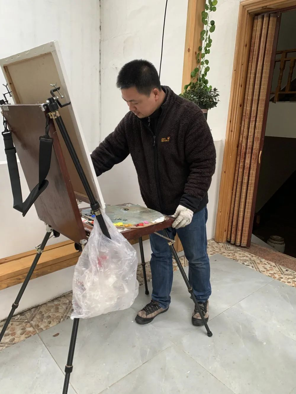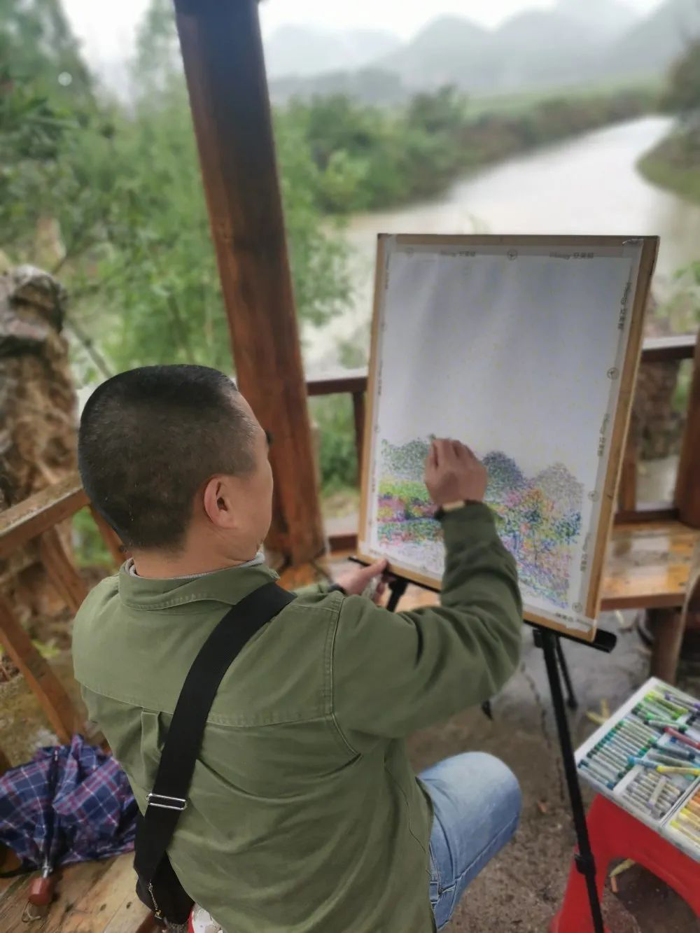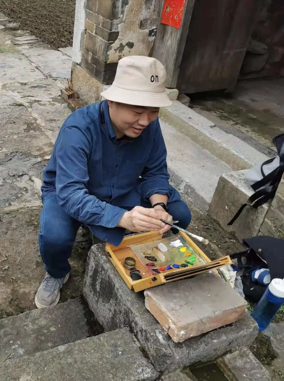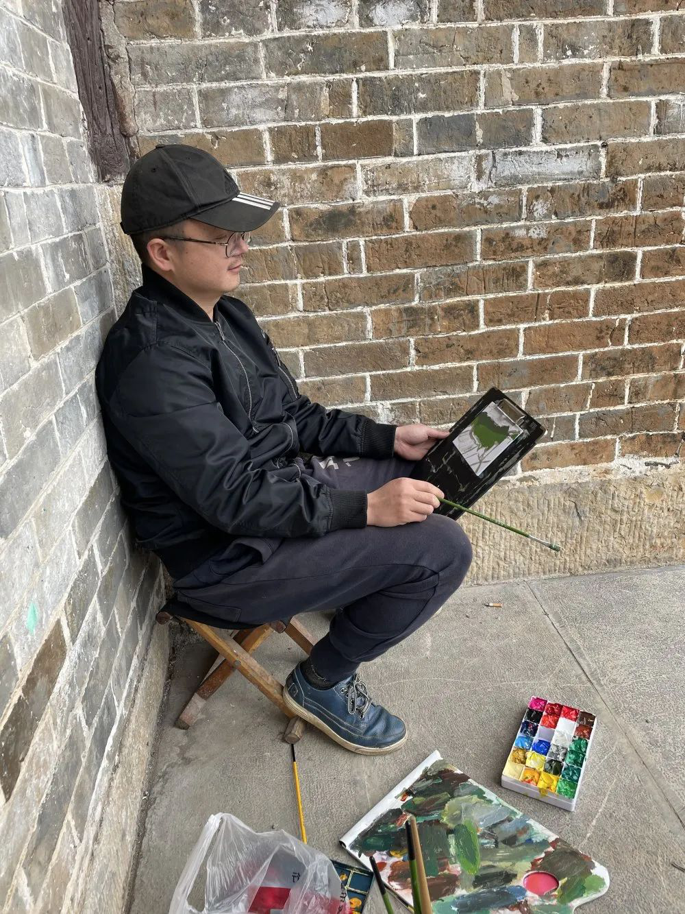 老师们第一个写生点---民风淳朴的小桃源村。在白墙黑瓦的民居楼下,不时有村民挽着裤腿牵着耕牛走过。初春的嫩芽刚刚从树梢抽出,寒气还没褪去,教师们纷纷拿着绘画工具走进山村,用自己的画笔将小桃源村的美好定格。25日一整天,老师们与画板为伴,沉浸在写生中,傍晚时分才回到写生基地。26日,由于当地暴雨,教师们选择在写生基地写生创作,在阳台、门廊里将雨中美景呈现在画面上。