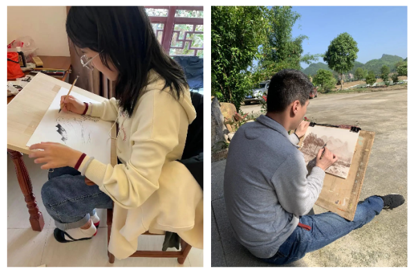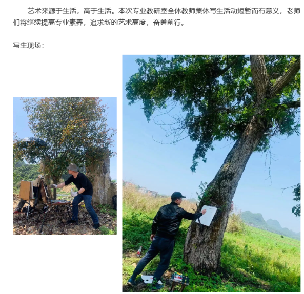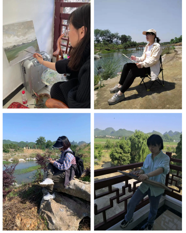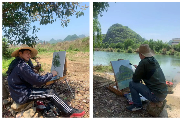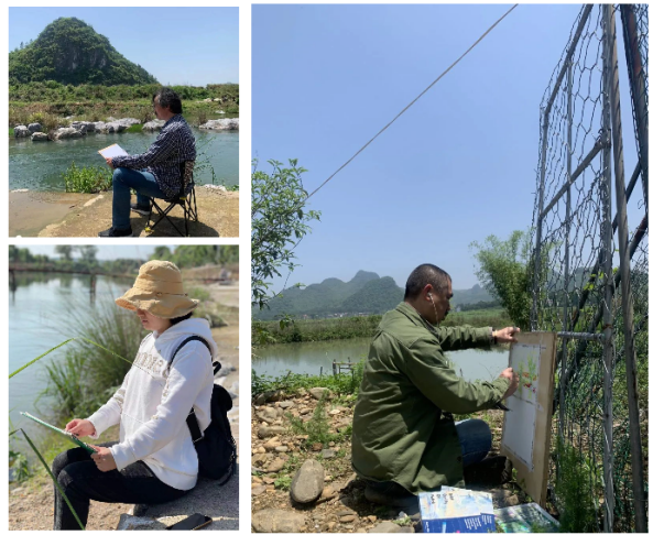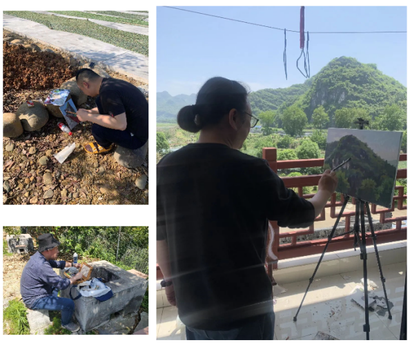 4月29号,老师们在写生基地附近采风,踩点,取景,架画板……根据各人的专业特长和对景物的感受,画油画、画丙烯、画国画、速写、油画棒、数字板绘等等形式多种多样。山不在高,有仙则灵,老师们深入村庄,探索光与色的规律,感受乡间淳朴的人文精神,收获颇丰。