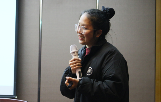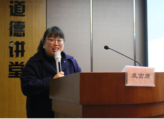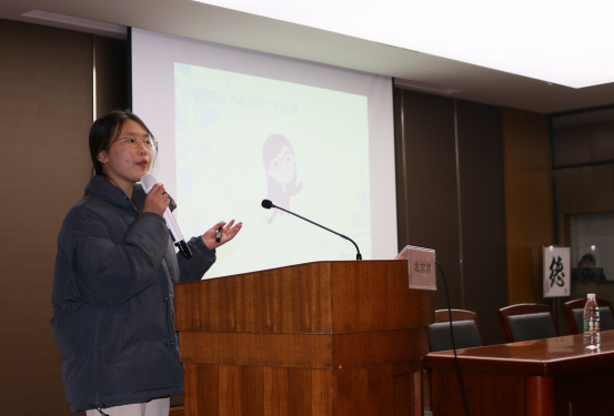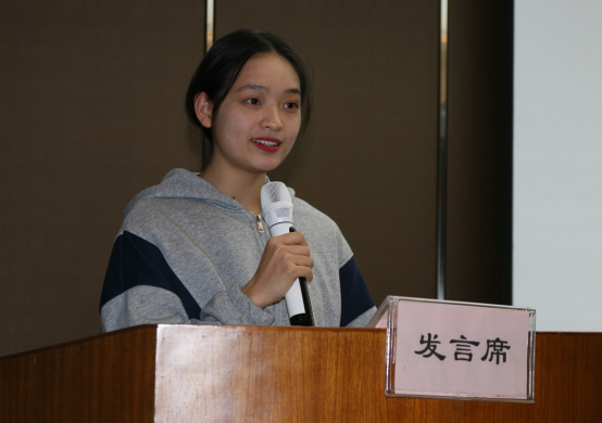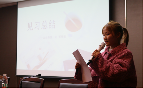 之后,四位学生代表上台分享见习心得。潘欣同学所带给大家的是,一名好的老师要给予学生足够的爱;