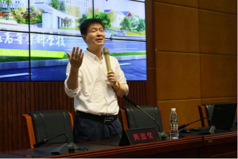 讲座由艺术系舞蹈教研室主任、舞蹈表演专业负责人李潇潇主持。艺术系伍莉主任、李伟强副主任、部分专业教师到场听讲座。对周固坚馆长到校开讲表示热烈欢迎后,并对其进行简短的介绍:周固坚为湖南省文化馆业务副馆长,研究馆员,著名导演,文旅部公共文化服务巡讲专家,中央文旅干部管理学院客座教授,国家艺术基金专家,中国舞蹈家协会会员,湖南省文旅厅艺术专家委员会委员、公共文化专家委员会委员、非遗专家委员会专家。策划导演国家、省级各类晚会(活动)1000多场,编创各类文艺作品200余个,30多个在中国艺术节“群星奖”、中国舞蹈“荷花奖”、湖南艺术节“三湘群星奖”等重大赛事中获奖,应邀赴北京、广东、广西、四川、福建、西藏、新疆等20多个省、市、自治区各类专业培训班授课。