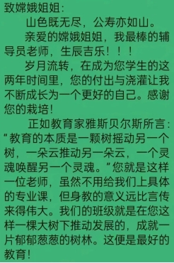 曾嫦娥的用心也得到了学生的回应,在曾嫦娥生日时,22级视传专业孙宜清同学也给她写了一封信,表达对她的感激和敬仰之情。信中写道:“正如教育家雅斯贝尔斯所言,教育的本质是一棵树摇动另一棵树,一朵云推动另一朵云,一个灵魂唤醒另一个灵魂。您就是这样一位老师,虽然不用给我们上具体的专业课,但身教的意义远比言传来得伟大。我们的班级就是在您这样一棵大树下推动发展的,成就一片郁郁葱葱的树林。这便是最好的教育!”