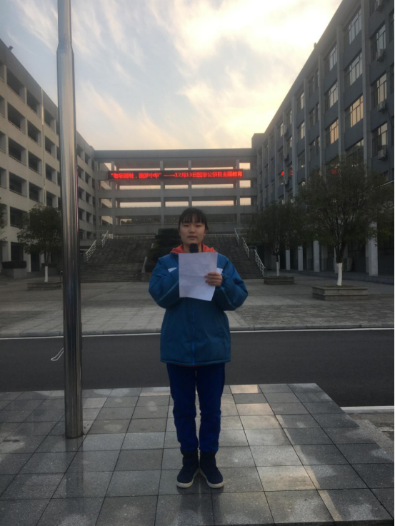 国旗总是伴着朝阳而升起,为迎接这一光荣而神圣的时刻,艺术系全体学生、班主任和部分教师代表于12月9日7点30分在升旗台下集结完毕,身穿整齐划一的校服,展现出了艺术系端庄大气的良好精神风貌。国歌响起,冉冉升起的国旗,肃穆而庄严,诠释着祖国的繁荣富强,充满朝气。1921班学生代表做了“勿忘国耻,圆满中华”主题演讲,重温了南京大屠杀这段血泪史,号召全体师生时刻怀有爱国之心,从身边的小事做起,处处体现爱国,一起为中华民族复兴努力奋斗。艺术系李伟强副主任做总结发言,回答了为什么设立国家公祭日的问题,宣传了《新时代爱国主义教育实施纲要》相关精神,并引导大家一定牢记“四个意识”、坚定“四个自信”、自觉做到“两个维护”,从小培养正德,努力学习,真正成人成才,把爱国之志变为报国之行。学校周文华副校长,校长助理、艺术系主任刘志华同志参加本次升旗仪式。