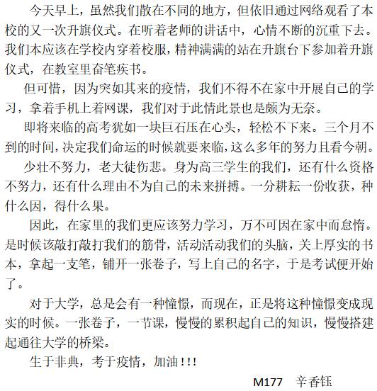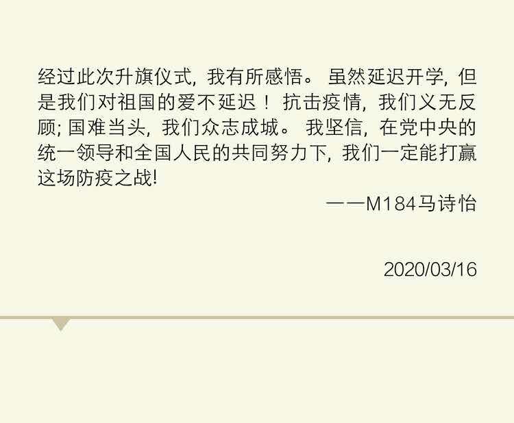 春暖花一定会开🧛🏿♀️,共同战“疫”一定会赢。凝心聚力🧪、满怀信心,线上升旗仪式一样饱含激情🙅🏿♀️,同享华夏民族之荣耀。坚定信心、同舟共济,我们终将打赢这场疫情防控阻击战,迎接我们的一定是春暖花开🤸♀️!