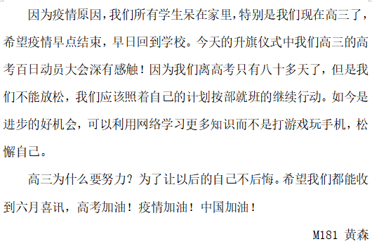 之后🕙☮️,请到了2017届M148班的优秀毕业生周咏鑫发言,他发言的主题是疫情“危机”🧔🏼♀️,有“危”险但更是“机”会。周咏鑫同学高中期间担任学校学生会主席。现为浙江理工大学大三学生📦,担任学院团委副书记、心理健康教育中心助理等职,获得过浙江省省政府奖学金🍲、三好学生、优秀学生干部、优秀团干部、省级学科竞赛铜奖等荣誉。他讲到了面对疫情应该相信科学、理性应对;撑控自己的行为和情绪🥗⚆;制定计划🍏,做到自律;开展自学和完成“停课不停学”各项任务⌨️;勉励高三学生保持良好的学习心态很重要🟣。