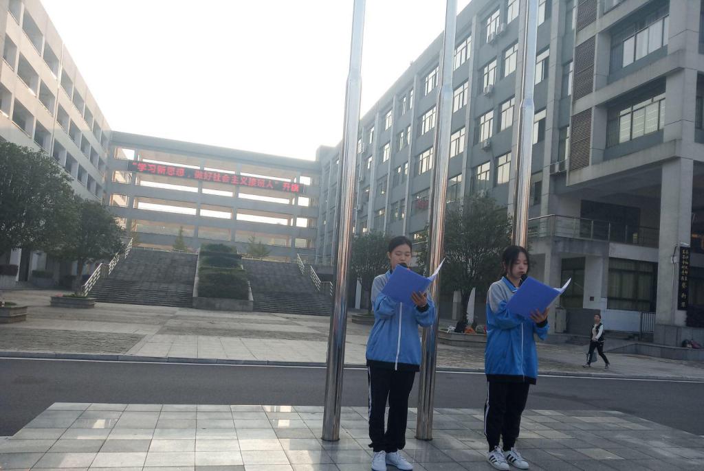 首先,由1815班贺佳谊和马紫轩两位同学进行国旗下讲话。她们提到:“身为中学生的我们,虽然目前无法对祖国做出巨大贡献,但我们可以从小事做起,例如我们可以坚定信念,做志存高远之人,青年时期的我们正处于人生的最佳年华,也是确立人生目标的关键时期。”她们用自己的话语激励着同学们,认真学习新思想,立志做好社会主义接班人。